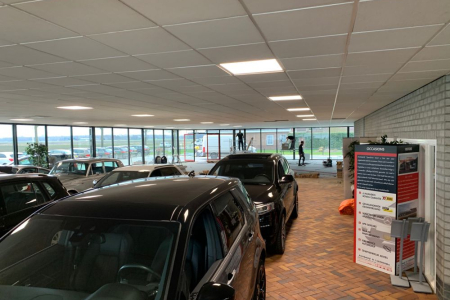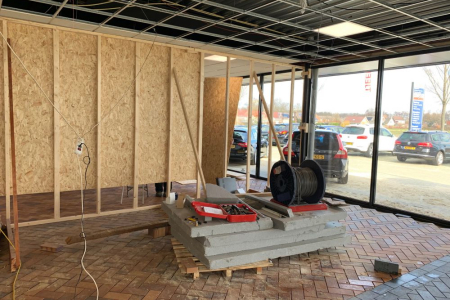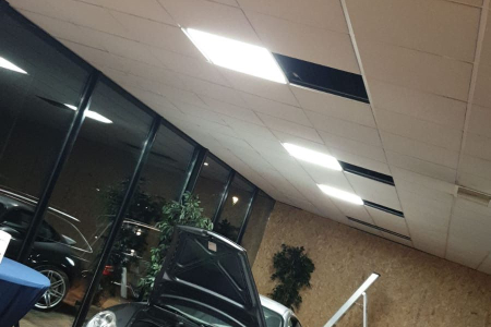 In de showroom is het plafond aangepakt. Het plafond in het nieuwe, aangebouwde gedeelte de showroom is vrijwel geheel afgewerkt en de plafondplaten van de gehele showroom zijn vernieuwd. Daarbij is ook de direct de verlichting en de elektra in het plafond aangepakt.