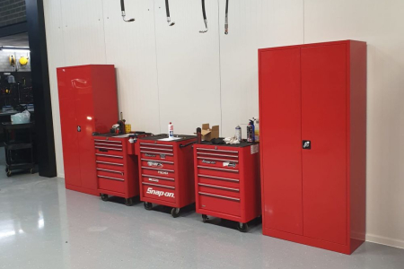 Alle opbergkasten voor bijvoorbeeld de uitleesapparatuur zijn geplaatst (gespoten in onze rode huisstijl kleur).