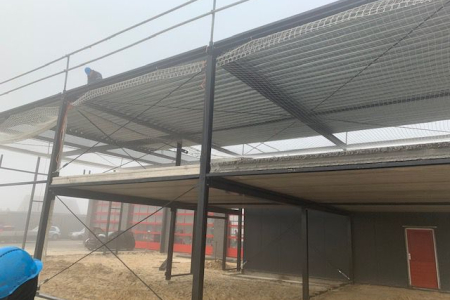 Als laatste zijn de netten aan de constructie bevestigd, dit alvast als voorbereiding om de dakplaten te legen.